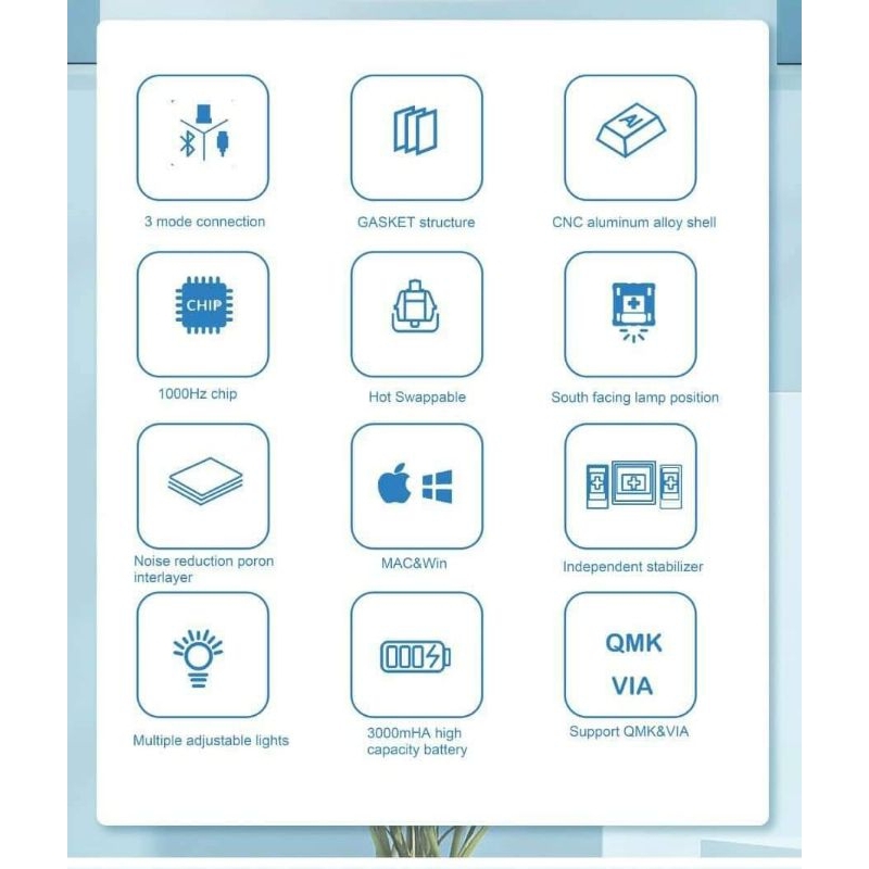 KIT không bao gồm switch và Keycap Thông số KIT: - Case nhôm 6063 CNC - 3 Mode - Pin 3000mAH - Keymap VIA - Gasket mount - Mạch xuôi RGB, Foam poron , ipxe , plate PC - Kèm stab stock - 3 màu lựa chọn : PINK , BLUE , GREEN Thống số keycap: - Màu sắc: Pink/Green/Blue - Số nút: 66 nút - Chất liệu: PBT Dyesub 5 mặt - Profile: MDA